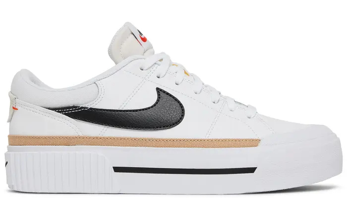 The Nike Women’s Court Legacy Lift ‘White Hemp’ pairs vintage style with modern platform tooling. White tumbled leather is utilized on the upper, accented with tonal stitching and a black retro Swoosh. The low-cut collar is built with padded textile, while a strip of beige canvas wraps around the base of the upper. Anchoring the sneaker is an elevated white rubber midsole, marked with a black pinstripe and a debossed Swoosh at the heel. Underfoot, the rubber outsole features a modified herringbone tread.